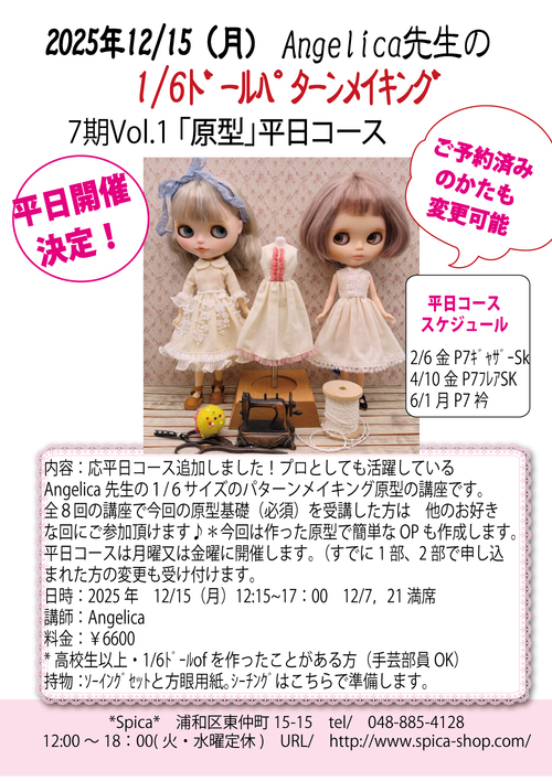 ★★こちらは平日コースです★★今後は隔週月曜又は金曜に開催予定です。すでに12/7,21お申し込みの方も変更承ります。プロのパタンナーであるAngelica先生をお呼びしての特別wsです!ミシンが出来ればどなたも参加出来ます。★じっくり質問出来るように お時間変更になりました。★12/7、21は満席です。変更の場合は通信欄にお申し込み済みのお日にちと変更希望とお書きください。no.Angelica20251215平日コース開設!【講師:Angelica】2025年12/15(月)Angelicaのドールパターンメイキング「7期生(Vol.1) / 基礎・原型」☆どなたもok/当日支払い(現金のみ)*12/7、21は満席【講座について】パターンメーキングを学びたい方(1/6ドール用アウトフィット)、色々なパターンをご自分でひいてみたい方にオススメの講座です。※参加対象:15才以上【日時】:2025年12/15(月)12:14〜17:00 【定員】6名【費用】¥6600(税込)【持ち物】○文具類方眼用紙(A4〜)、筆記用具(シャープペン:0.3がオススメ・消しゴム:ペンタイプのものがオススメ)方眼定規、メジャー(細い物が良い)、カーブ定規(あると良い)、紙用はさみ、メンディングテープ○裁縫道具類チャコペン、布用はさみ、まち針(パッチワーク用の小さいものや頭が耐熱ガラスのものがオススメ)、糸切りハサミ、縫い針、糸(その他使いやすい道具があればご自由にお持ちください)エプロン(必要であれば)、ネオブライス★終了後、完成した作品を着せて撮影会をしますのでドールをお連れください。【内容】プロのパターンナーAngelica先生をお招きして行う1/6サイズのドールパターンメイキング講座です。全8回の講座で今回の原型基礎(必須)を受講した方は他のお好きな回にご参加頂けます。*今回は作った原型で簡単なOPも作成します。・ミシン・アイロンは教室にございます。(台数が少ない為、譲りあってご利用ください)・パターンのクラスでは生徒様に道具をご用意頂きます。お忘れ物のないようご注意くださいませ。(オススメと同じものが揃わなくても大丈夫です)※紛失防止の為、道具のお名前記入をお願い致します。・今回の型紙の原型はネオブライスのデフォルトボディ用のものを使用しますので、お持ち頂くブライスもデフォルトボディがオススメです。また今後、可動ボディのパターン教室も開催予定です。・最後に作ったパターンで実際に縫製しますが お時間がおしてしまった場合は残りをお家で制作いただく場合が有ります。【今後のカリキュラムについて】★今回の基礎原型を受講されますと どの回もご参加可能になります。 各回ごとに募集しますので ご自身のご都合に合わせてご参加いただけます。ドールパターンメーキング講座カリキュラム(基礎編)原型基礎AギャザースカートBフレアースカートC衿D袖原型E袖応用FコートGワンピースドールパターンメーキング講座カリキュラム(応用編 )基本のパンツ(ストレート)ニット素材のワンピースカシュクールワンピース(縫い代)オフショルダーブラウスプリンセスラインワンピース基本のオーバーオール(ストレートパンツ)フィッシュテールドレスつなぎ ラグラン(ファスナーあき)Bigサイズ、マチ付きカーゴポケット縫製ジャケット&リアルポケットパンツ (2日間)12,000円spicaテーラードジャケット&リアルポケットパンツ(2日間)ピーコート耳付きフードボアジレビスチェピンタックのロンパースセーラーブラウス&プリーツスカート(卒業)(2日間)【ご予約について】[ご予約方法]ご来店の場合はレジにてスタッフにお声掛けください。お電話での場合は営業時間内にご連絡ください。(営業時間12:00〜18:00)ネットご予約の場合はカートよりご予約ください。ご予約段階ではお支払いは不要です。当日Spicaにてお支払い下さい。ワークショップのお支払いは現金のみとさせていただきます。定員が満員に達してからのご予約の場合、キャンセル待ちとさせて頂きます。[キャンセルについて]やむを得ない場合は、教室開催の1週間前までに必ずご連絡下さい。(※キャンセルはなるべくお控えください。)外部講師をお招きしてのWSですので、1週間をきったキャンセルに関しましてはキャンセル料として後日半額お支払いをお願い致します。※不参加の場合の追加講習は予定しておりません。【ご参加の際のご注意】WS開始の5分前にはご来店ください。WSに参加されないお連れ様のご見学はスペースの関係や進行上不可とさせていただきます。終了のお時間になりましたらお店でお待ち合わせいただくなどでご対応宜しくお願い致します。※自粛期間再開、台風等、ご来店に危険が生じると判断した場合、講師の体調不良などやむなく中止させて頂く場合がございます。(ご相談の上、振替日を設けさせて頂く場合もございます。)【お客様へのお願い]★ご予約済みのお客様に、WS数日前にお店から開催か延期をお電話でご連絡致します。・教室参加の方は、店舗入り口にて検温を行います。(37.5度以上の発熱の場合、WSの参加はお断りさせて頂きます。)----以上の事をご確認の
