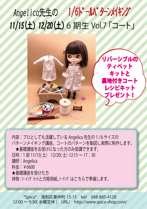 プロのパタンナーであるAngelica先生をお呼びしての特別wsです!ミシンが出来ればどなたも参加出来る回です。Angelica20251220WS2025年12/20(土)Angelicaのドールパターンメイキング6期生優先「コート」(当日支払い・現金のみ)★基礎講座を受けた方【講座について】パターンメーキングを学びたい方(1/6ドール用アウトフィット)、色々なパターンをご自分でひいてみたい方にオススメの講座です。※参加対象:15才以上【日時】:12/20(土)12:15〜17:30【定員】6名【費用】¥6600(税込)【内容】プロとしても活躍しているAngelica先生の1/6サイズのパターンメイキング講座。コートのパターンを製図し実際に制作します。 ★基礎講座をお受けになった方のみ受講できます。【持ち物】○文具類方眼用紙(A4〜)、筆記用具(シャープペン:0.3がオススメ・消しゴム:ペンタイプのものがオススメ)方眼定規、メジャー(細い物が良い)、カーブ定規(あると良い)、紙用はさみ、メンディングテープ○裁縫道具類チャコペン、布用はさみ、まち針(パッチワーク用の小さいものや頭が耐熱ガラスのものがオススメ)、糸切りハサミ、縫い針、糸(その他使いやすい道具があればご自由にお持ちください)エプロン(必要であれば)、ネオブライス★終了後、完成した作品を着せて撮影会をしますのでドールをお連れください。・ミシン・アイロンは教室にございます。(台数が少ない為、譲りあってご利用ください)・パターンのクラスでは生徒様に道具をご用意頂きます。お忘れ物のないようご注意くださいませ。(オススメと同じものが揃わなくても大丈夫です)※紛失防止の為、道具のお名前記入をお願い致します。・今回の型紙の原型はネオブライスのデフォルトボディ用のものを使用しますので、お持ち頂くブライスもデフォルトボディがオススメです。また今後、可動ボディのパターン教室も開催予定です。・最後に作ったパターンで実際に縫製しますが お時間がおしてしまった場合は残りをお家で制作いただく場合が有ります。【ご予約について】[ご予約方法]ご来店の場合はレジにてスタッフにお声掛けください。お電話での場合は営業時間内にご連絡ください。(営業時間12:00〜18:00)ネットご予約の場合はカートよりご予約ください。ご予約段階ではお支払いは不要です。当日Spicaにてお支払い下さい。ワークショップのお支払いは現金のみとさせていただきます。定員が満員に達してからのご予約の場合、キャンセル待ちとさせて頂きます。[キャンセルについて]やむを得ない場合は、教室開催の1週間前までに必ずご連絡下さい。(※キャンセルはなるべくお控えください。)外部講師をお招きしてのWSですので、1週間をきったキャンセルに関しましてはキャンセル料として後日全額お支払いをお願い致します。※感染症等流行っておりますので、しばらくはキャンセル料は半額のお支払いに変更させて頂きます。※2020.2変更※不参加の場合の追加講習は予定しておりません。【ご参加の際のご注意】WS開始の5分前にはご来店ください。WSに参加されないお連れ様のご見学はスペースの関係や進行上不可とさせていただきます。終了のお時間になりましたらお店でお待ち合わせいただくなどでご対応宜しくお願い致します。※自粛期間再開、台風等、ご来店に危険が生じると判断した場合、講師の体調不良などやむなく中止させて頂く場合がございます。(ご相談の上、振替日を設けさせて頂く場合もございます。)[お客様へのお願い]★ご予約済みのお客様に、WS数日前にお店から開催ご案内をお電話又はSNS、メールでご連絡致します。----以上の事をご確認の上、お申込下さい。