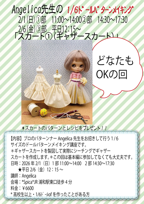 プロのパタンナーであるAngelica先生をお呼びしての特別wsです!Angelica202602010206WS2026年2/1(日)2/6(金)Angelicaのドールパターンメイキング7期生優先「ギャザースカート」(当日支払い・現金のみ)★どなたも参加OK【講座について】パターンメーキングを学びたい方(1/6ドール用アウトフィット)、色々なパターンをご自分でひいてみたい方にオススメの講座です。※参加対象:15才以上【日時】2/1(日)1部11:00〜14:00 2部14:30〜17:30 2/6(金)12:15〜 *日時をお選びください【定員】6名【費用】¥6600(税込)【内容】*ギャザースカートを製図して実際にシーチングでギャザースカートを作成します。*この回は基本編に参加してなくても大丈夫です。【持ち物】○文具類方眼用紙(A4〜)、筆記用具(シャープペン:0.3がオススメ・消しゴム:ペンタイプのものがオススメ)方眼定規、メジャー(細い物が良い)、カーブ定規(あると良い)、紙用はさみ、メンディングテープ○裁縫道具類チャコペン、布用はさみ、まち針(パッチワーク用の小さいものや頭が耐熱ガラスのものがオススメ)、糸切りハサミ、縫い針、糸(その他使いやすい道具があればご自由にお持ちください)エプロン(必要であれば)、ネオブライス★終了後、完成した作品を着せて撮影会をしますのでドールをお連れください。・ミシン・アイロンは教室にございます。(台数が少ない為、譲りあってご利用ください)・パターンのクラスでは生徒様に道具をご用意頂きます。お忘れ物のないようご注意くださいませ。(オススメと同じものが揃わなくても大丈夫です)※紛失防止の為、道具のお名前記入をお願い致します。・今回の型紙の原型はネオブライスのデフォルトボディ用のものを使用しますので、お持ち頂くブライスもデフォルトボディがオススメです。また今後、可動ボディのパターン教室も開催予定です。・最後に作ったパターンで実際に縫製しますが お時間がおしてしまった場合は残りをお家で制作いただく場合が有ります。【ご予約について】[ご予約方法]ご来店の場合はレジにてスタッフにお声掛けください。お電話での場合は営業時間内にご連絡ください。(営業時間12:00〜18:00)ネットご予約の場合はカートよりご予約ください。ご予約段階ではお支払いは不要です。当日Spicaにてお支払い下さい。ワークショップのお支払いは現金のみとさせていただきます。定員が満員に達してからのご予約の場合、キャンセル待ちとさせて頂きます。[キャンセルについて]やむを得ない場合は、教室開催の1週間前までに必ずご連絡下さい。(※キャンセルはなるべくお控えください。)外部講師をお招きしてのWSですので、1週間をきったキャンセルに関しましてはキャンセル料として後日全額お支払いをお願い致します。※感染症等流行っておりますので、しばらくはキャンセル料は半額のお支払いに変更させて頂きます。※2020.2変更※不参加の場合の追加講習は予定しておりません。【ご参加の際のご注意】WS開始の5分前にはご来店ください。WSに参加されないお連れ様のご見学はスペースの関係や進行上不可とさせていただきます。終了のお時間になりましたらお店でお待ち合わせいただくなどでご対応宜しくお願い致します。※自粛期間再開、台風等、ご来店に危険が生じると判断した場合、講師の体調不良などやむなく中止させて頂く場合がございます。(ご相談の上、振替日を設けさせて頂く場合もございます。)[お客様へのお願い]★ご予約済みのお客様に、WS数日前にお店から開催ご案内をお電話又はSNS、メールでご連絡致します。----以上の事をご確認の上、お申込下さい。