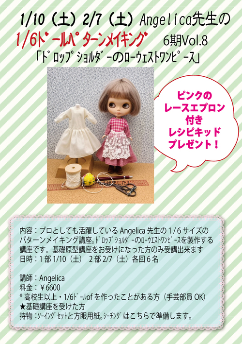 プロのパタンナーであるAngelica先生をお呼びしての特別wsです!Angelica20260207WS2026年2/7(土)Angelicaのドールパターンメイキング6期生優先「ドロップショルダーのローウエストワンピース」(当日支払い・現金のみ)★基礎講座を受けた方【講座について】パターンメーキングを学びたい方(1/6ドール用アウトフィット)、色々なパターンをご自分でひいてみたい方にオススメの講座です。※参加対象:15才以上【日時】:2/7(土)12:15〜17:30【定員】6名【費用】¥6600(税込)【内容】プロとしても活躍しているAngelica先生の1/6サイズのパターンメイキング講座。ドロップショルダーのローウエストワンピースのパターンを製図し実際に制作します。 ★基礎講座をお受けになった方のみ受講できます。【持ち物】○文具類方眼用紙(A4〜)、筆記用具(シャープペン:0.3がオススメ・消しゴム:ペンタイプのものがオススメ)方眼定規、メジャー(細い物が良い)、カーブ定規(あると良い)、紙用はさみ、メンディングテープ○裁縫道具類チャコペン、布用はさみ、まち針(パッチワーク用の小さいものや頭が耐熱ガラスのものがオススメ)、糸切りハサミ、縫い針、糸(その他使いやすい道具があればご自由にお持ちください)エプロン(必要であれば)、ネオブライス★終了後、完成した作品を着せて撮影会をしますのでドールをお連れください。・ミシン・アイロンは教室にございます。(台数が少ない為、譲りあってご利用ください)・パターンのクラスでは生徒様に道具をご用意頂きます。お忘れ物のないようご注意くださいませ。(オススメと同じものが揃わなくても大丈夫です)※紛失防止の為、道具のお名前記入をお願い致します。・今回の型紙の原型はネオブライスのデフォルトボディ用のものを使用しますので、お持ち頂くブライスもデフォルトボディがオススメです。また今後、可動ボディのパターン教室も開催予定です。・最後に作ったパターンで実際に縫製しますが お時間がおしてしまった場合は残りをお家で制作いただく場合が有ります。【ご予約について】[ご予約方法]ご来店の場合はレジにてスタッフにお声掛けください。お電話での場合は営業時間内にご連絡ください。(営業時間12:00〜18:00)ネットご予約の場合はカートよりご予約ください。ご予約段階ではお支払いは不要です。当日Spicaにてお支払い下さい。ワークショップのお支払いは現金のみとさせていただきます。定員が満員に達してからのご予約の場合、キャンセル待ちとさせて頂きます。[キャンセルについて]やむを得ない場合は、教室開催の1週間前までに必ずご連絡下さい。(※キャンセルはなるべくお控えください。)外部講師をお招きしてのWSですので、1週間をきったキャンセルに関しましてはキャンセル料として後日全額お支払いをお願い致します。※感染症等流行っておりますので、しばらくはキャンセル料は半額のお支払いに変更させて頂きます。※2020.2変更※不参加の場合の追加講習は予定しておりません。【ご参加の際のご注意】WS開始の5分前にはご来店ください。WSに参加されないお連れ様のご見学はスペースの関係や進行上不可とさせていただきます。終了のお時間になりましたらお店でお待ち合わせいただくなどでご対応宜しくお願い致します。※自粛期間再開、台風等、ご来店に危険が生じると判断した場合、講師の体調不良などやむなく中止させて頂く場合がございます。(ご相談の上、振替日を設けさせて頂く場合もございます。)[お客様へのお願い]★ご予約済みのお客様に、WS数日前にお店から開催ご案内をお電話又はSNS、メールでご連絡致します。----以上の事をご確認の上、お申込下さい。