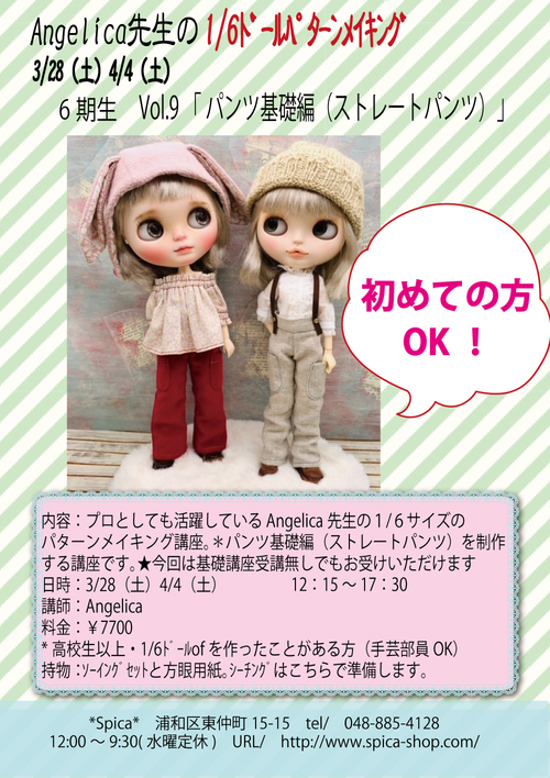 プロのパタンナーであるAngelica先生をお呼びしての特別wsです!Angelica202603280404WS2026年3/28(土)4/4(土)Angelicaのドールパターンメイキング6期生優先「パンツ基礎編(ストレートパンツ」(当日支払い・現金のみ)★どなたもご参加可能★ご希望の日時をお選びください【講座について】パターンメーキングを学びたい方(1/6ドール用アウトフィット)、色々なパターンをご自分でひいてみたい方にオススメの講座です。※参加対象:15才以上【日時】:3/28(土)4/4(土)12:15〜17:30【定員】6名【費用】¥7700(税込)【内容】内容:プロとしても活躍しているAngelica先生の1/6サイズのパターンメイキング講座。*パンツ基礎編(ストレートパンツ)を制作する講座です。★今回は基礎講座受講無しでもお受けいただけます*高校生以上・1/6ドールofを作ったことがある方(手芸部員OK)持物:ソーイングセットと方眼用紙。シーチングはこちらで準備します。【持ち物】○文具類方眼用紙(A4〜)、筆記用具(シャープペン:0.3がオススメ・消しゴム:ペンタイプのものがオススメ)方眼定規、メジャー(細い物が良い)、カーブ定規(あると良い)、紙用はさみ、メンディングテープ○裁縫道具類チャコペン、布用はさみ、まち針(パッチワーク用の小さいものや頭が耐熱ガラスのものがオススメ)、糸切りハサミ、縫い針、糸(その他使いやすい道具があればご自由にお持ちください)エプロン(必要であれば)、ネオブライス★終了後、完成した作品を着せて撮影会をしますのでドールをお連れください。・ミシン・アイロンは教室にございます。(台数が少ない為、譲りあってご利用ください)・パターンのクラスでは生徒様に道具をご用意頂きます。お忘れ物のないようご注意くださいませ。(オススメと同じものが揃わなくても大丈夫です)※紛失防止の為、道具のお名前記入をお願い致します。・今回の型紙の原型はネオブライスのデフォルトボディ用のものを使用しますので、お持ち頂くブライスもデフォルトボディがオススメです。また今後、可動ボディのパターン教室も開催予定です。・最後に作ったパターンで実際に縫製しますが お時間がおしてしまった場合は残りをお家で制作いただく場合が有ります。【ご予約について】[ご予約方法]ご来店の場合はレジにてスタッフにお声掛けください。お電話での場合は営業時間内にご連絡ください。(営業時間12:00〜18:00)ネットご予約の場合はカートよりご予約ください。ご予約段階ではお支払いは不要です。当日Spicaにてお支払い下さい。ワークショップのお支払いは現金のみとさせていただきます。定員が満員に達してからのご予約の場合、キャンセル待ちとさせて頂きます。[キャンセルについて]やむを得ない場合は、教室開催の1週間前までに必ずご連絡下さい。(※キャンセルはなるべくお控えください。)外部講師をお招きしてのWSですので、1週間をきったキャンセルに関しましてはキャンセル料として後日全額お支払いをお願い致します。※感染症等流行っておりますので、しばらくはキャンセル料は半額のお支払いに変更させて頂きます。※2020.2変更※不参加の場合の追加講習は予定しておりません。【ご参加の際のご注意】WS開始の5分前にはご来店ください。WSに参加されないお連れ様のご見学はスペースの関係や進行上不可とさせていただきます。終了のお時間になりましたらお店でお待ち合わせいただくなどでご対応宜しくお願い致します。※自粛期間再開、台風等、ご来店に危険が生じると判断した場合、講師の体調不良などやむなく中止させて頂く場合がございます。(ご相談の上、振替日を設けさせて頂く場合もございます。)[お客様へのお願い]★ご予約済みのお客様に、WS数日前にお店から開催ご案内をお電話又はSNS、メールでご連絡致します。----以上の事をご確認の上、お申込下さい。