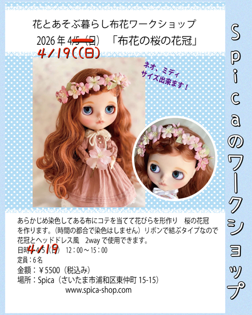FlowerN20260419WS 2026年4/19(日)花とあそぶ暮らし先生の布花ワークショップ-「桜の花冠」 先生のご都合によりお日にち変更になりました ・会費:¥5500 (材料代含む・税込) ・開催日:2026年4/19(日) ・時間:12:00〜15:00 ・内容:「花とあそぶ暮らし」先生の布花ワークショップ第3弾 あらかじめ染色してある布にコテを当てて花びらを形作り桜の花冠を作ります。(時間の都合で染色はしません)リボンで結ぶタイプなので花冠とヘッドドレス風 2wayで使用できます。。 ・持ち物:完成後、撮影を行います。ブライスをお連れください ハサミ(小さめの布用)、目打ちなどの裁縫道具をお持ちください。 ・作業を行いますので気になる方はエプロンをご用意ください。 ※WSに参加されないお連れ様のWSご見学はスペースの関係や進行上不可とさせていただきます。 終了のお時間になりましたらお店でお待ち合わせいただくなどでご対応宜しくお願い致します。予めご了承下さい。 [ご予約方法] ネットでのご予約方法:カートよりご予約ください。(お電話・店頭でのご予約も可) ※キャンセルはなるべく早くご連絡ください。 開催1週間を切ったキャンセルは材料代半額をご負担頂きます。(材料をお渡し致します。)