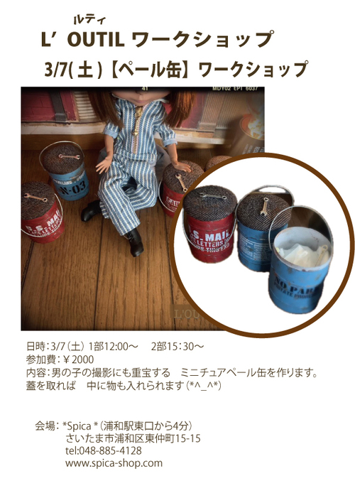 LOUTIL20260307WS【講師:L’OUTIL】2026年3/7(土)「ペール缶ワークショップ」1部よりお入れします※当日支払い(現金のみ)【日時】:2026年3/7(土) 1部12:00〜15:00 2部15:30〜18:30(1部満席の場合)【定員】各回6名【費用】¥2000 【持ち物】エプロン(必要であれば)、★終了後、完成した作品と撮影会をしますのでドールをお持ちの方はお連れください。【内容】男の子の撮影にも重宝する ミニチュアペール缶を作ります。蓋を取れば 中に物も入れられます(*^_^*)・初心者の方でも簡単に作れる内容になっております。・小学生からご参加頂けます。(お一人で作業が難しいご年齢のお子様は、ご家族の方もご一緒に参加をお願いしております。)※WSに参加されないお連れ様のWSご見学はスペースの関係や進行上不可とさせていただきます。【ご予約について】[ご予約方法]ご来店の場合はレジにてスタッフにお声掛けください。お電話での場合は営業時間内にご連絡ください。(営業時間12:00〜18:00)ネットご予約の場合はカートよりご予約ください。ご予約段階ではお支払いは不要です。当日Spicaにてお支払い下さい。※ワークショップのお支払いは現金のみとさせていただきます。定員が満員に達してからのご予約の場合、キャンセル待ちとさせて頂きます。2部構成のワークショップは1部から予約をお入れします。2部の時間でしか参加できない場合は電話、メール、インスタDMからお問い合わせください。[キャンセルについて]やむを得ない場合は、教室開催の1週間前までに必ずご連絡下さい。(※キャンセルはなるべくお控えください。)外部講師をお招きしてのWSですので、1週間をきったキャンセルに関しましてはキャンセル料として後日全額お支払いをお願い致します。※感染症等流行っておりますので、しばらくはキャンセル料は半額のお支払いに変更させて頂きます。※2020.2変更※不参加の場合の追加講習は予定しておりません。【ご参加の際のご注意】WS開始の5分前にはご来店ください。WSに参加されないお連れ様のご見学はスペースの関係や進行上不可とさせていただきます。終了のお時間になりましたらお店でお待ち合わせいただくなどでご対応宜しくお願い致します。※自粛期間再開、台風等、ご来店に危険が生じると判断した場合、講師の体調不良などやむなく中止させて頂く場合がございます。(ご相談の上、振替日を設けさせて頂く場合もございます。)【お客様へのお願い]★ご予約済みのお客様に、WS数日前にお電話かインスタでご連絡致します。----以上の事をご確認の上、お申込下さい。