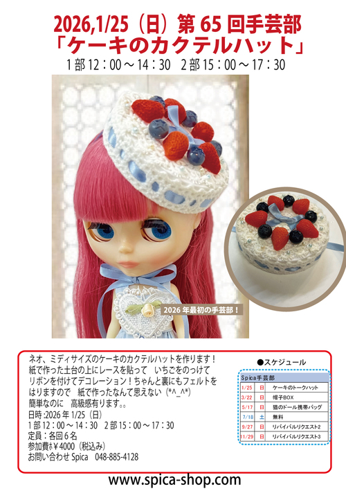 ★ボンドで作るドール服no.club20260125・2026年1/25(日) Spica手芸部「第65回 ケーキのカクテルハット」※当日支払い(現金のみ)*1部よりお入れします【日時】2026年1/25(日) 1部 12:00〜14:30 2部 15:00〜17:30(1部満席の場合開催) 【定員】各回6名【費用】¥4000【内容】ネオ、ミディサイズのケーキのカクテルハットを作ります。厚紙で土台を作り それにレースやいちご リボンでデコレーションしていきます。簡単な作りなので お家でお好きな生地 パーツで色々つくれます。ネオ、ミディサイズが有りますので 通信欄にお書きください。【持ち物】エプロン(必要であれば)、ブライス等ドール★終了後、完成した作品と撮影会をしますのでドールをお持ちの方はお連れください。・初心者の方でも簡単に作れる内容になっております。・小学生からご参加頂けます。(お一人で作業が難しいご年齢のお子様は、ご家族の方もご一緒に参加をお願いしております。)※WSに参加されないお連れ様のWSご見学はスペースの関係や進行上不可とさせていただきます。【ご予約について】[ご予約方法]ご来店の場合はレジにてスタッフにお声掛けください。お電話での場合は営業時間内にご連絡ください。(営業時間12:00〜18:00・水曜以外)ネットご予約の場合はカートよりご予約ください。ご予約段階ではお支払いは不要です。当日Spicaにてお支払い下さい。※ワークショップのお支払いは現金のみとさせていただきます。定員が満員に達してからのご予約の場合、キャンセル待ちとさせて頂きます。2部構成のワークショップは1部から予約をお入れします。2部の時間でしか参加できない場合は電話、メール、インスタDMからお問い合わせください。[キャンセルについて]やむを得ない場合は、教室開催の1週間前までに必ずご連絡下さい。(※キャンセルはなるべくお控えください。)1週間をきったキャンセルに関しましてはキャンセル料、キット代として後日半額お支払いをお願い致します。【ご参加の際のご注意】WS開始の5分前にはご来店ください。WSに参加されないお連れ様のご見学はスペースの関係や進行上不可とさせていただきます。終了のお時間になりましたらお店でお待ち合わせいただくなどでご対応宜しくお願い致します。※自粛期間再開、台風等、ご来店に危険が生じると判断した場合、講師の体調不良などやむなく中止させて頂く場合がございます。(ご相談の上、振替日を設けさせて頂く場合もございます。)[お客様へご連絡]★ご予約済みのお客様に、WS数日前にお店から開催のご連絡をお電話又はインスタでご連絡致します。----以上の事をご確認の上、お申込下さい。