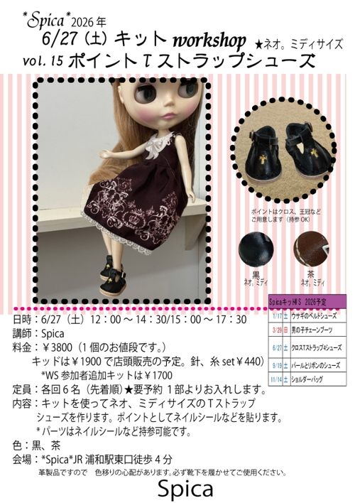 no.kitWS202606272026年6/27(土)キットワークショップ「ポイントTストラップシューズ」1部からお入れします。 お色、サイズをお選びください。当日支払い(クレジット不可)★1部満席の場合2部に切り替わるのにお時間がかかる場合があります。・デザイン:ポイントTストラップシューズ・会費:¥3800(材料代含む・税込)*追加でキットご購入は¥1700・開催日:2026年6/27(土)・時間:1部12:00〜14:30 (1部満席の場合開催 2部15:00〜17:30 )・定員 各回6名 ・色とサイズ:ネオ-黒(満席),茶(4) ミディ-黒(2),白(2)*第1希望、第2希望をお選びください ・内容:キットを使ってネオ、ミディサイズのTストラップシューズを作ります。 ポイントとしてネイルシールなどを貼ります。*パーツはネイルシールなど持参可能です。・持ち物:完成後、撮影を行います。ブライスをお連れください・作業を行いますので気になる方はエプロンをご用意ください。・道具・材料はSpicaで用意致します。・中学生以上。※WSに参加されないお連れ様のWSご見学はスペースの関係や進行上不可とさせていただきます。終了のお時間になりましたらお店でお待ち合わせいただくなどでご対応宜しくお願い致します。予めご了承下さい。[ご予約方法]ネットでのご予約方法:カートよりご予約ください。(お電話・店頭でのご予約も可)ご予約段階ではお支払いは不要です。当日Spicaにて¥3800(税込・材料費込み)をお支払い下さい定員が満員に達してからのご予約の場合、キャンセル待ちとさせて頂きます。★ご予約済みのお客様に、WS数日前にお店から開催か延期をお電話でご連絡致します。ご注文時に御希望のお時間 ・お色を通信欄にお書きください※キャンセルはなるべく早くご連絡ください。開催1週間を切ったキャンセルは材料代¥1900をご負担頂きます。(材料をお渡し致します。)