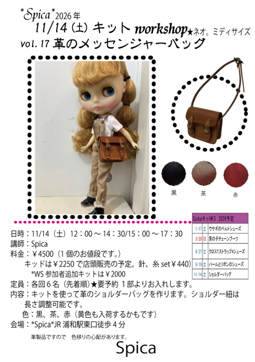 no.kitWS202611142026年11/14(土)第17回キットワークショップ「革のメッセンジャーバッグ」1部からお入れします。 お色をお選びください。当日支払い(クレジット不可)・デザイン:革のメッセンジャーバック・会費:¥4500(材料代含む・税込)*追加でキットご購入は¥2000・開催日:2026年11/14(土)・時間:1部12:00〜14:30 (満席) 2部15:00〜17:30・定員 各回6名 ・色:黒(3),赤(1),茶(0)*第1希望、第2希望をお書きください(再入荷の可能性有り) ・内容:キットを使って革のショルダーバッグを作ります。ショルダー紐は長さ調整可能です。・持ち物:完成後、撮影を行います。ブライスをお連れください・作業を行いますので気になる方はエプロンをご用意ください。・道具・材料はSpicaで用意致します。・中学生以上。※WSに参加されないお連れ様のWSご見学はスペースの関係や進行上不可とさせていただきます。終了のお時間になりましたらお店でお待ち合わせいただくなどでご対応宜しくお願い致します。予めご了承下さい。[ご予約方法]ネットでのご予約方法:カートよりご予約ください。(お電話・店頭でのご予約も可)ご予約段階ではお支払いは不要です。当日Spicaにて¥4500(税込・材料費込み)をお支払い下さい定員が満員に達してからのご予約の場合、キャンセル待ちとさせて頂きます。★ご予約済みのお客様に、WS数日前にお店から開催か延期をお電話でご連絡致します。ご注文時に御希望のお時間 ・お色を通信欄にお書きください※キャンセルはなるべく早くご連絡ください。開催1週間を切ったキャンセルは材料代¥2250をご負担頂きます。(材料をお渡し致します。)