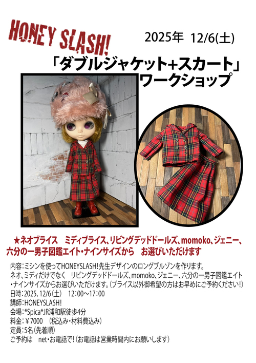 ※以下の詳細を一読お願いします。ご注文頂いた時点でご了承頂いたものとします。※満席になりましたら キャンセル待ちのご予約を開始します。カート切り替えまでお時間がかかる場合があります。※記載ドールでブライス以外の場合はお早めにご予約ください。no.ws20251206HONEYSLASH【講師:HONEY SLASH!】2025年12/6(土)「ダブルジャケット+スカート」ワークショップ/ ブライス他沢山のドール対応」残り1名※当日支払い(現金のみ)【日時】2025年12/6(土)12:00〜17:00 【定員】5名【費用】¥7000(税込)【持ち物】裁縫道具、ドール、エプロン(必要であれば)★終了後、完成した作品を着せて撮影会をしますのでドールをお連れください。【内容】ミシンを使ってHONEYSLASH!先生デザインの「ダブルジャケット+スカート」を制作します。ブライスだけでなく色々なサイズのドールサイズで作れます。お好きなサイズをお選びください! ☆ サイズは ネオブライス、ミディブライス、リビングデッドドールズ、momoko、ジェニー、六分の一男子図鑑エイト・ナインサイズから選べます。※ネオ、ミディ以外の方は型紙を起こしますのでお早めにお申し込みください。※参加資格-中学生以上【ご予約について】[ご予約方法]ご来店の場合はレジにてスタッフにお声掛けください。お電話での場合は営業時間内にご連絡ください。(営業時間12:00〜18:00)ネットご予約の場合はカートよりご予約ください。ご予約段階ではお支払いは不要です。当日Spicaにてお支払い下さい。※ワークショップのお支払いは現金のみとさせていただきます。定員が満員に達してからのご予約の場合、キャンセル待ちとさせて頂きます。[キャンセルについて]やむを得ない場合は、教室開催の1週間前までに必ずご連絡下さい。(※キャンセルはなるべくお控えください。)外部講師をお招きしてのWSですので、1週間をきったキャンセルに関しましてはキャンセル料として後日全額お支払いをお願い致します。※感染症等流行っておりますので、しばらくはキャンセル料は半額のお支払いに変更させて頂きます。※2020.2変更※不参加の場合の追加講習は予定しておりません。【ご参加の際のご注意】WS開始の5分前にはご来店ください。WSに参加されないお連れ様のご見学はスペースの関係や進行上不可とさせていただきます。終了のお時間になりましたらお店でお待ち合わせいただくなどでご対応宜しくお願い致します。※自粛期間再開、台風等、ご来店に危険が生じると判断した場合、講師の体調不良などやむなく中止させて頂く場合がございます。(ご相談の上、振替日を設けさせて頂く場合もございます。)以上の事をご確認の上、お申込下さい。